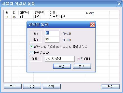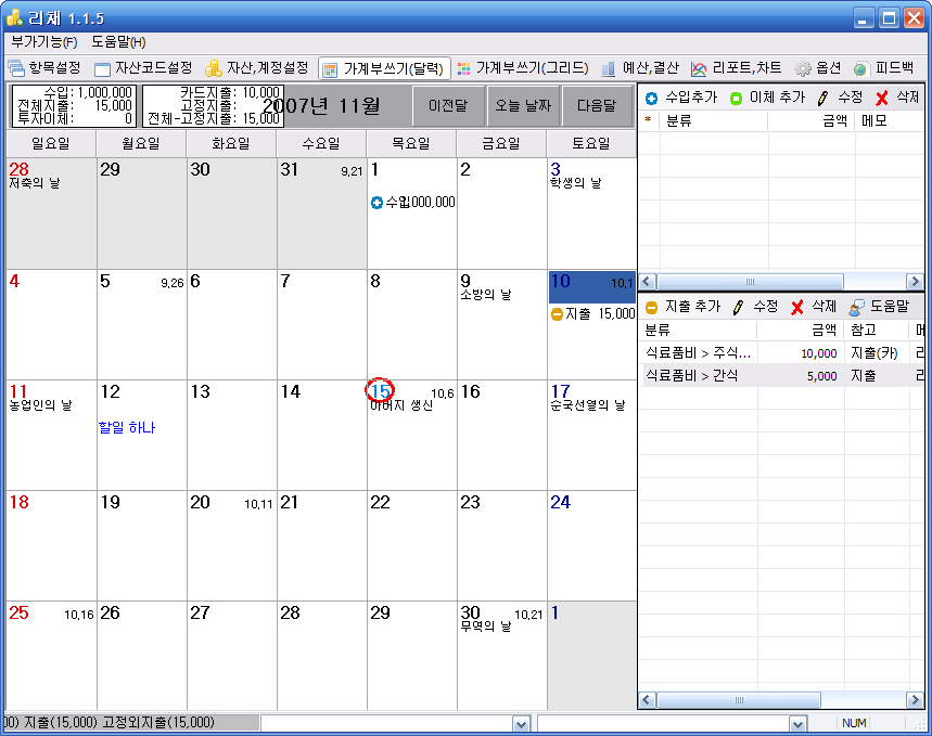 지출 추가나 수입추가를 눌러서 거래를 입력하는 창입니다. 입력된 거래를 더블클릭하면 수정할 수 있습니다. 날짜를 더블클릭하면 메모를 입력합니다. 부가기능-나의 기념일 입력에서 사용자의 기념을 입력하면, 달력에 빨간 동그라미가 쳐집니다.
