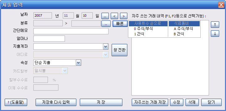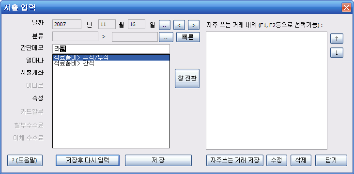 두번째는 지출 거래를 입력하면서 메모에 "라면, 김밥"이라고 입력하고 항목을 "간식"으로 입력하고 나서 저장을 하고 다시 지출 거래를 입력하면서 메모에 "라면, 쫄면"이라고 입력하고 항목을 "외식"으로 입력하고 나서 저장을 했다고 가정하면 다음 거래 입력시 "라면"이라고 입력하면 "간식"과 "외식"의 후보가 동시에 뜨고 "쫄면"이라고 입력하면 "외식"만 뜹니다.