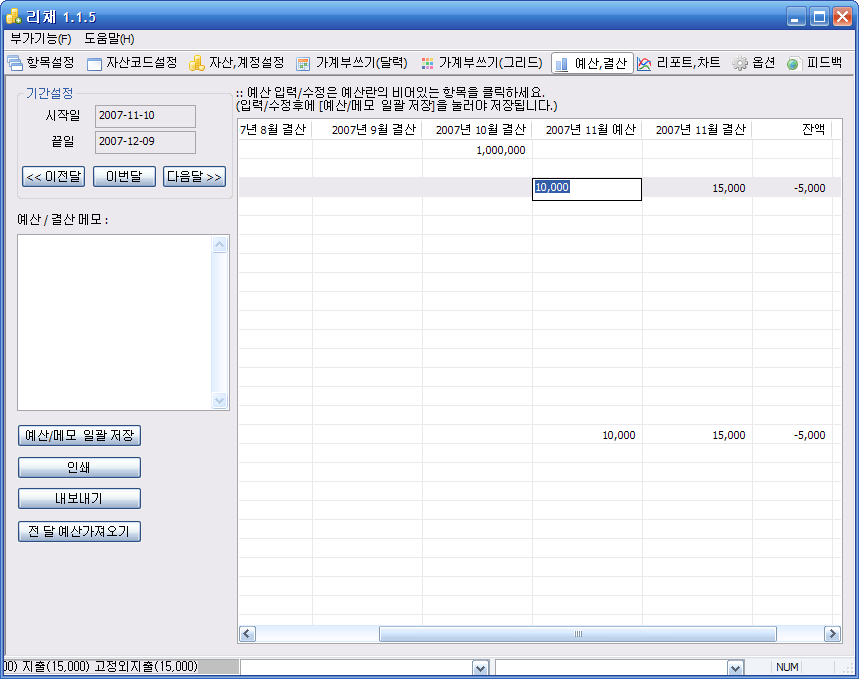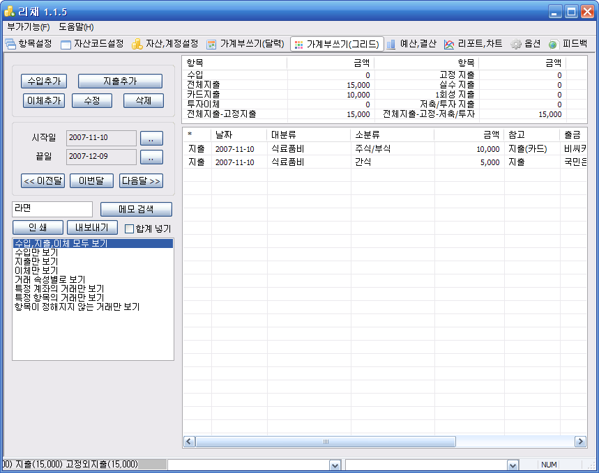 가계부 프로그램을 처음 개발해야 겠다는 맘을 먹은 것은 2004년도 말 쯤 같습니다. 현재는 가계부 프로그램이 주로 웹기반으로 개발되는 것 같습니다. 2004년도에도 웹 기반이 주였고, 프로그램으로 되어 있는 것은 많지 않았습니다. 그 중에서 따꿈이 가계부 라는 것을 사용했었는데, 현재는 버전업이 되지 않고 있습니다. 기본기능은 충실했으나 부가기능이 많이 부족합니다. 당시 저는 콘트롤 가능한 지출과, 어쩔수 없는 고정지출을 분리해서 파악하는 기능에 관심을 가지고 있었는데, 이런 부가기능을 제공하는 가계부 프로그램은 어디에서도 찾을 수가 없었습니다. 개발을 해야겠다고 생각은 했지만 1년이 지나도록 메모와 벤치마킹, 필수구현 목록을 정리하며 세월을 보내기만 했습니다. 2006년도에 들어서야 어프라인 가계부 리채를 본격적으로 개발하기 시작했습니다.