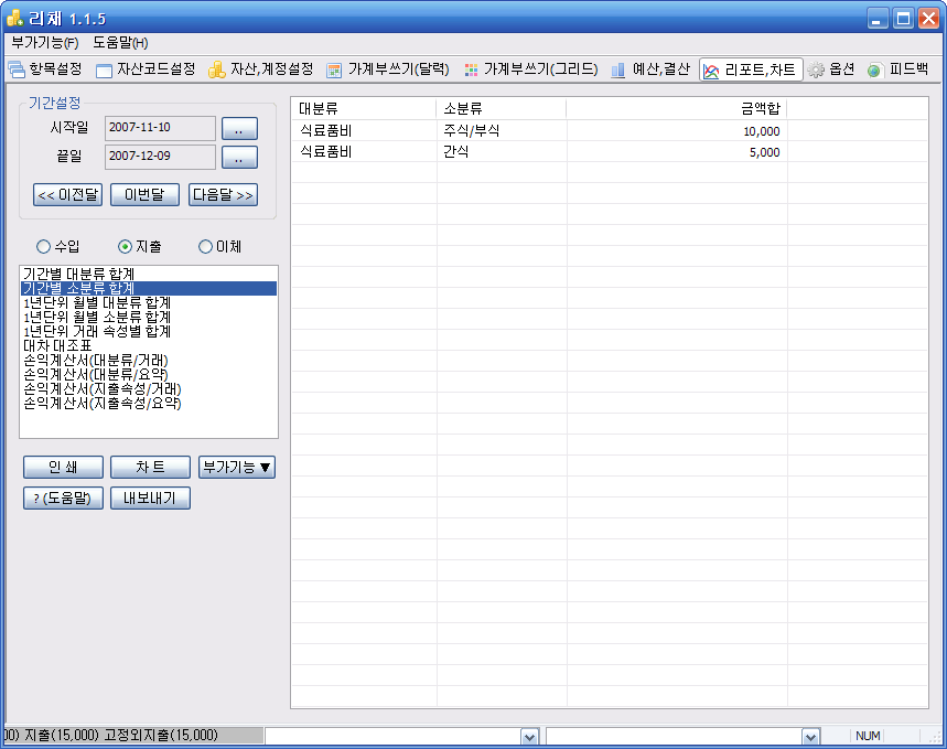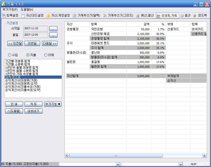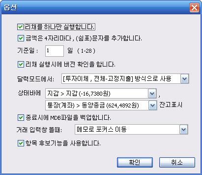 저 같은 경우에는 계정의 잔액 맞추기에 신경쓰면 너무 피곤하기 때문에, 잔액은 거의 신경쓰지 않습니다. 처음 몇 달간은 잔액이 맞지 않으면 신경이 쓰여서 상당히 피곤했었고, 지출을 추적하느라 시간을 상당히 낭비해야 했습니다. 요즘은 지출은 종이나 수첩 혹은 휴대폰에 기록해 두었다가, 몇 일 간격으로 입력하고, 생각나지 않는 지출은 그냥 무시합니다. 지출을 간편하게 기록하는것에만 신경쓰고, 다른건 무시하여, 가계부쓰기 자체에 너무 많은 에너지를 뺏기지 않도록 하고 있습니다. 가계부쓰기 자체가 시간이 많이 걸리고 신경쓰이는 일이라면, 가계부쓰기를 계속할 수 없습니다. 또 어떤 경우는 구조적으로 잔액 맞추기가 힘들때가 있습니다. 예를 들면, 친구랑 저녁을 먹고, 2만원이 나왔는데 친구가 1만원을 저한테 주고 제가 카드결재를 했다고 치면, 잔액을 맞추려면, 1만원을 지갑 계좌로 기타수입발생, 2만원 카드지출로 기록해야 합니다. 그렇게 되면, 잔액은 맞지만, 저는 수입이 늘어난 것도 아니고, 지출을 2만원 한 것도 아니기 때문에, 결국에는 한 달의 통계에는 오류가 발생합니다. 그래서 이런 경우는 카드지출 1만원으로 계산하고, 현금으로 1만원 들어온 것은 기록하지 않는 것입니다. 또 카드지출의 경우도 실제로 기록되는 금액과 결재되는 금액이 맞지 않을 가능성이 높습니다. 각종 할인이나, 수수료, 포인트등을 모두 고려하여 기록하기가 귀찮고 시간이 많이 걸리기 때문입니다. 리채는 지출의 양을 파악하는것이 목적이지, 잔액 맞추기가 목적이 아니기 때문입니다. 잔액 맞추기는 나중에 한 달에 한 번씩 필요할 때에 하고 있습니다. BR>그리고 지출의 속성중에 고정지출과 일반지출은 확실히 구별하고 있습니다. 고정지출은 기부, 종신보험(해약하기 전까지 돈을 찾을수 없기때문에 사실상 고정지출로 처리하지만, 다른 분들의 경우 지출이 아닌 투자이체로 처리할 수도 있음), 인터넷비, 휴대폰비(이건 매달 거의 일정하고, 줄인다고 줄여지지 않기 때문에 고정지출), 각종 주거비, 후불교통카드대금(이건 줄인다고 줄여지는 것이 아니기 때문), 부모님용돈 정도입니다. 제가 줄일려고 노력해도 거의 줄지 않는 지출 항목은 고정지출로 표시합니다. 그리고 쓰는 동안에 내내 확인하는 것은 전체 지출에서 고정 지출을 뺀 지출입니다. 달력창에도 그리드창에도 항상 표시됩니다. 이 지출이야 말로, 제가 매달 일정하게 유지하거나, 오히려 감소시켜야할 지출입니다. 만약에 이 항목에서 지난 달에 10만원 초과 지출되었다면 이 달에는 이 항목을 봐가며 지출을 줄이려고 통제합니다.