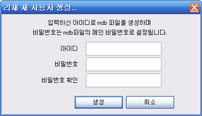 [새 사용자]을 눌러서 새로운 사용자를 생성하게 되면 리채 설치폴더아래의 data 폴더에 '아이디.mdb' 파일이 생성됩니다. 만약에 아이디를 test로 하였다면, test.mdb파일이 생성되는 식입니다.
