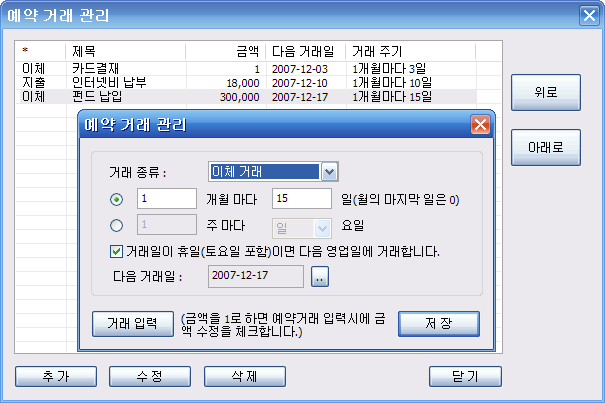 예약거래는 x개월마다 y일 패턴과 x주 마다 y요일에 입력하는 것이 가능합니다. 특히 0개월 마다 6일로 하게되면, 6일마다 거래가 자동 입력됩니다. 금액을 1로 지정하여 저장하게 되면, 자동 거래입력창에서 더블클릭해서 금액만 수정해서 입력할 수 있습니다.
