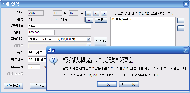할부거래는 매달 해당 날짜(할부 거래입력란)에 자동거래 입력창이 뜹니다.