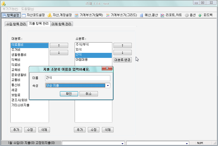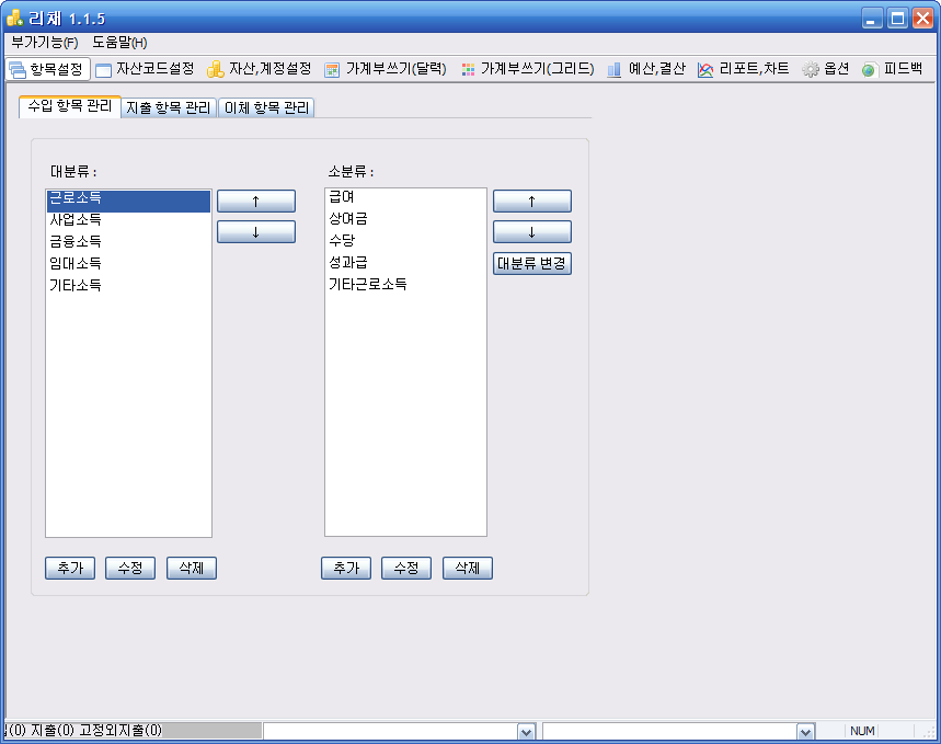 수입, 이체 , 대체거래에 대해서 항목을 설정할 수 있습니다. 항목은 대분류, 소분류로 나눠지고, 각각 이름과 순서를 추가, 삭제, 변경할 수 있습니다.