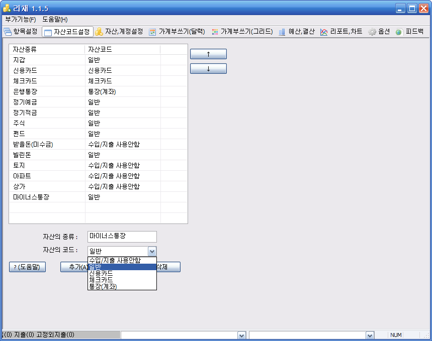 자산의 코드는 다음에 설명할 자산/계정창을 위한 분류코드를 입력하는 창입니다. 특별한 것은 없습니다. 다만 자산의 속성에 보면 '수입/지출 사용안함'이 있는데 이것으로 설정하게 되면 거래입력창에서 계정에 표시가 되지 않습니다. 토지나 상가처럼 거래할일 거의 없는 자산은 이렇게 설정합니다.