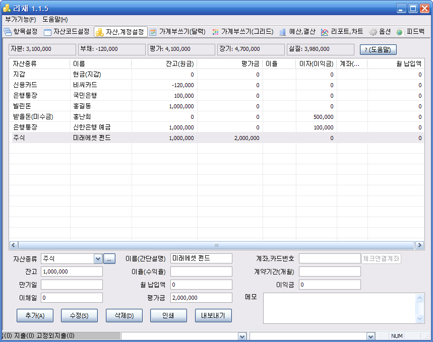 장기는 일정 기간이 지난후에 자본을 의미합니다. 위의 예를 들자면 예금의 이자는 받을 수 없지만, 1년 후에는 받을 수 있고, 예금을 깰 생각이 없다면 이자금액인 10만원 장기자본에 합산됩니다. 마찬가지로 받을돈이 있기는 하지만 당장 받을 수 없고 언제 받을 지도 모른다면 장기자본에 해당합니다. 이런 금액은 잔액은 0이며 이익금에 미래에 받을 금액을 입력해 둡니다. 평가금+장기 이익금 입니다.
