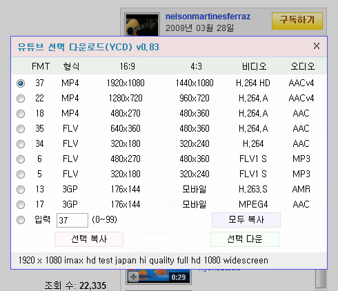 * 1920x1080인 FMT 37을 추가했습니다. 이거 작년에 나왔는데, 게을러서 이제야 하는군요. Download #1 : WMP_YCD2.0.83.png (43.3 KB), Hit : 1,000 Download #2 : WMP_YCD2.0.83.exe (169.8 KB), Hit : 2,167