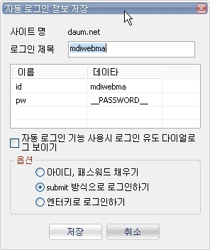 2) 자동로그인 유도 다이얼로그는 만약 사이트를 여러개 저장했을 경우에 [도구-폼 정보 저장 로드-사이트 자동 로그인 사용]기능에 체크되어 있다면 해당 사이트를 방문시에