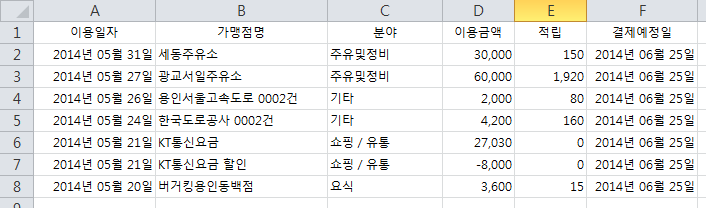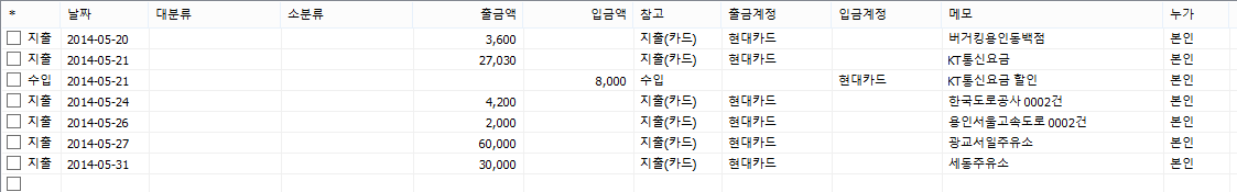 이용일시와 가맹점명, 지출금액은 반드시 제대로 선택을 하여야 한다. 입금금액과 분류는 선택 사항이다.