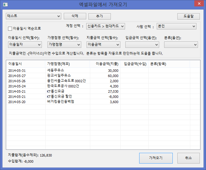 이렇게 입력후 다시 엑셀 임포트를 해 보면 성공적으로 항목이 인식이 됨을 알 수 있다. 엑셀 임포트창의 분류의 값도 메모와 항목후보의 값을 이용하여 항목을 찾는다.