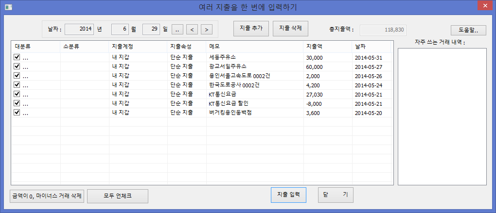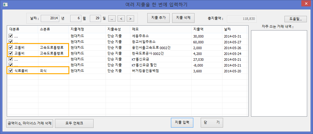 체크를 해제하면 해당 거래는 지출입력이 되지 않는다.