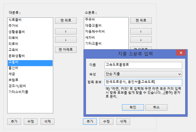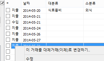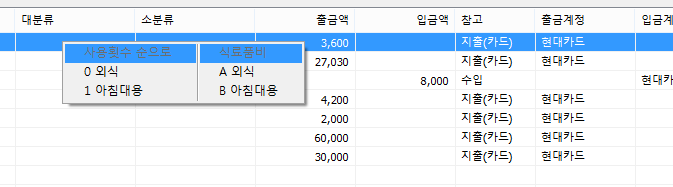 항목이 없는 거래의 대분류 와 소분류 위치에서 마우스 우클릭을 하게 되면 빠른 메뉴를 통해서 항목을 입력할 수 있다.